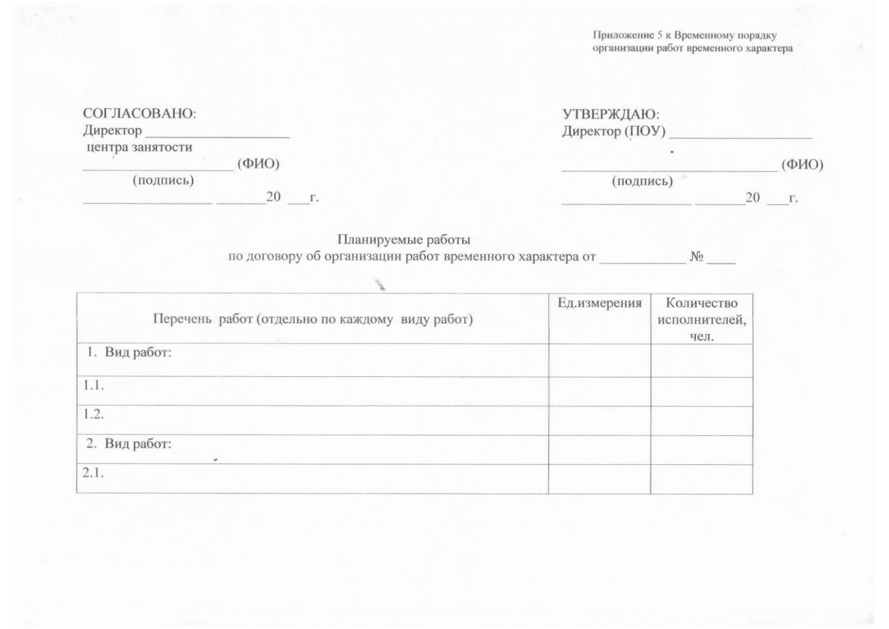 «Между центром занятости и работодателем заключается договор (Приложение № 3). Неотъемлемой частью договора является смета расходов — финансовый план использования средств на организацию работ временного характера с определением объема и направлений их использования (Приложение № 4) и планируемые работы по договору об организации работ временного характера (Приложение № 5).».
