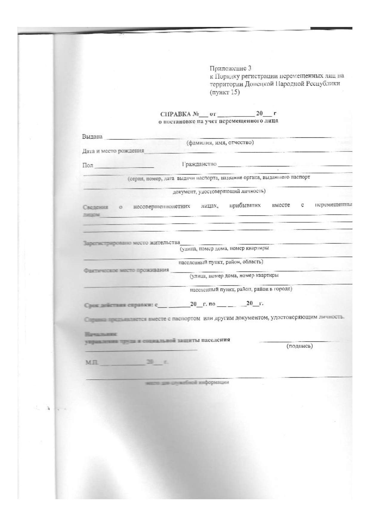 Справка является документом, подтверждающим факт постановки на учет перемещенного лица, и основанием назначения социальной поддержки и социальных выплат в соответствии с действующим законодательством Донецкой Народной Республики.