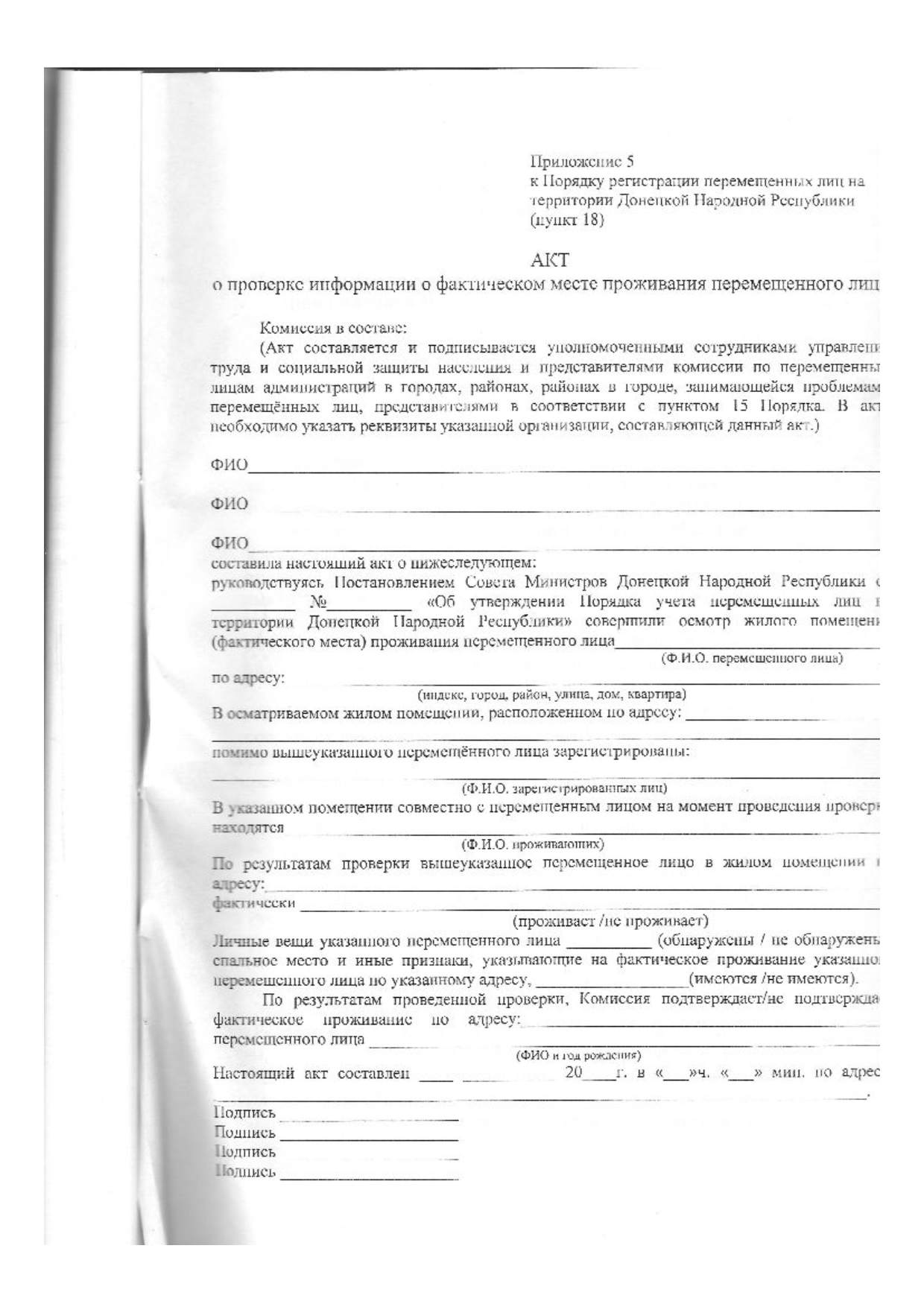 1) не реже одного раза в три месяца проводят проверку фактического проживания перемещенного лица по указанному им адресу, о чем составляется акт (Приложение 5);