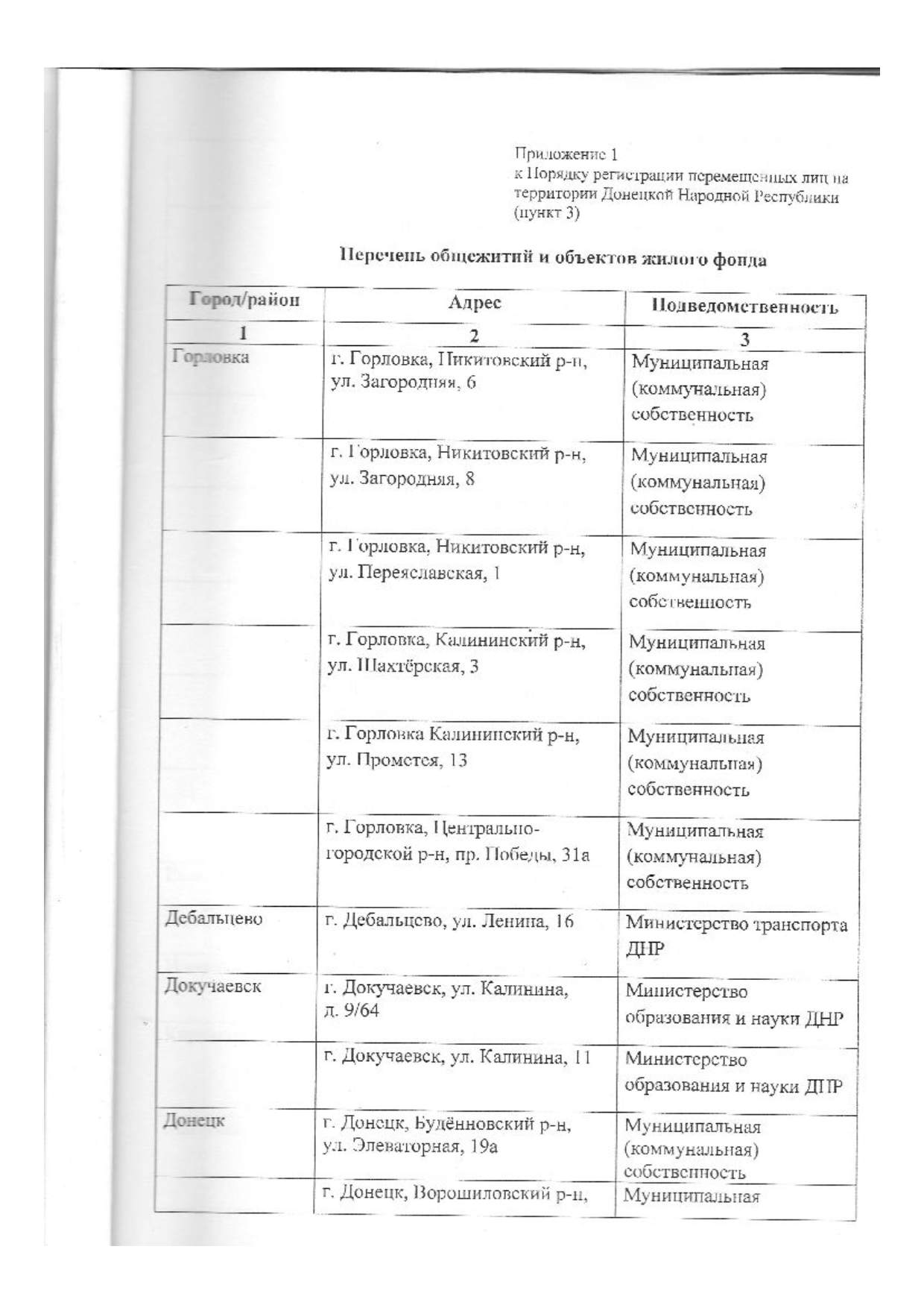 3. Регистрация перемещенных лиц, согласно настоящего Порядка, осуществляется в общежитиях и объектах жилого фонда (Приложение 1).