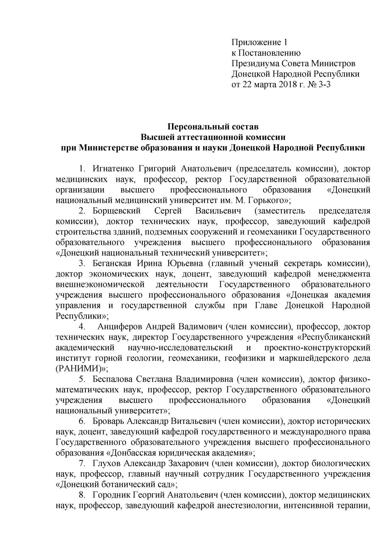 - Внести изменения в Приложение 1 Постановления Совета Министров Донецкой Народной Республики от 24 июля 2015 г. № 14-9 «Об утверждении состава Высшей аттестационной комиссии при Министерстве образования и науки Донецкой Народной Республики», утвердив его в новой редакции (приложение 1). (Постановление Совета Министров ДНР № 14-9 от 24.07.2015 г. утратило силу Постановлением Правительства ДНР № 75-10 от 20.11.2020 г.).