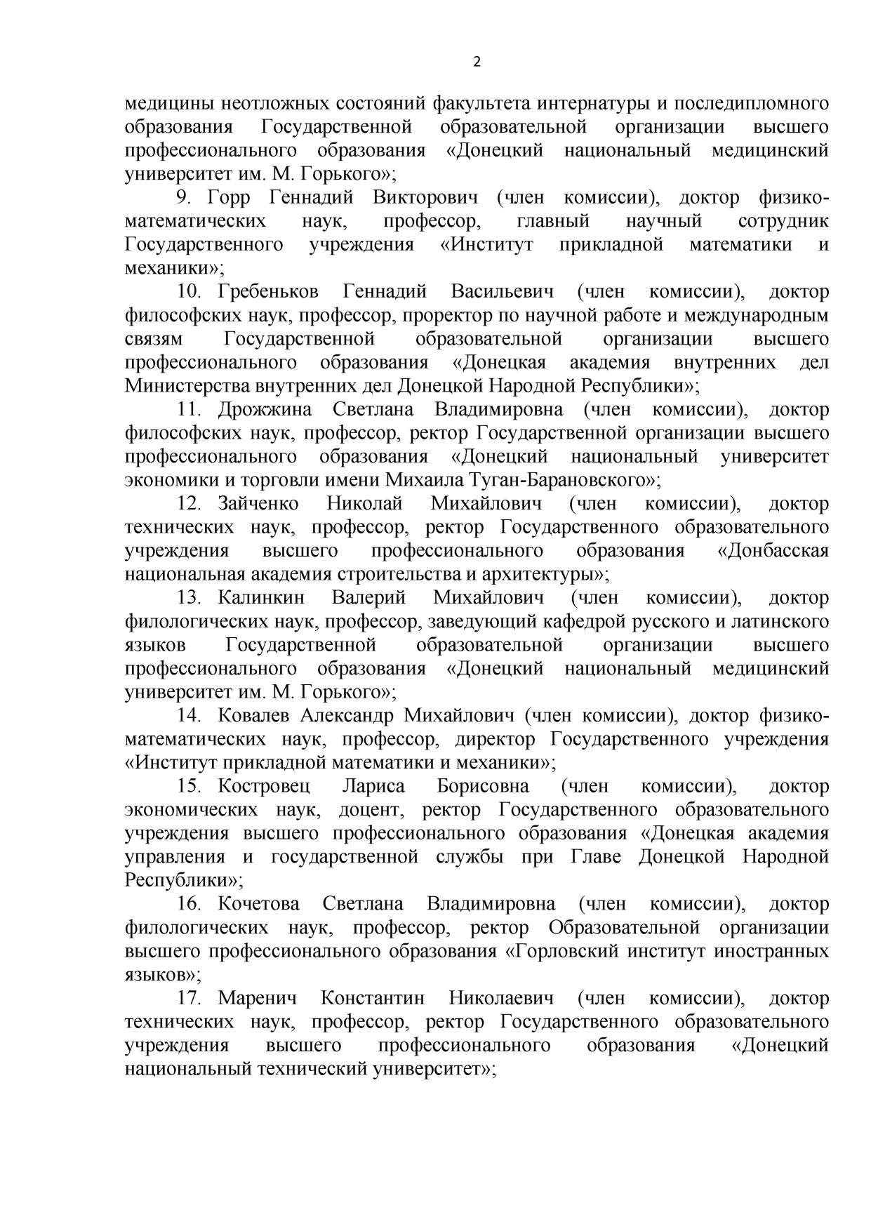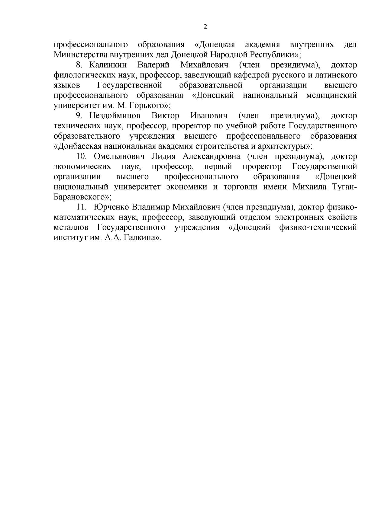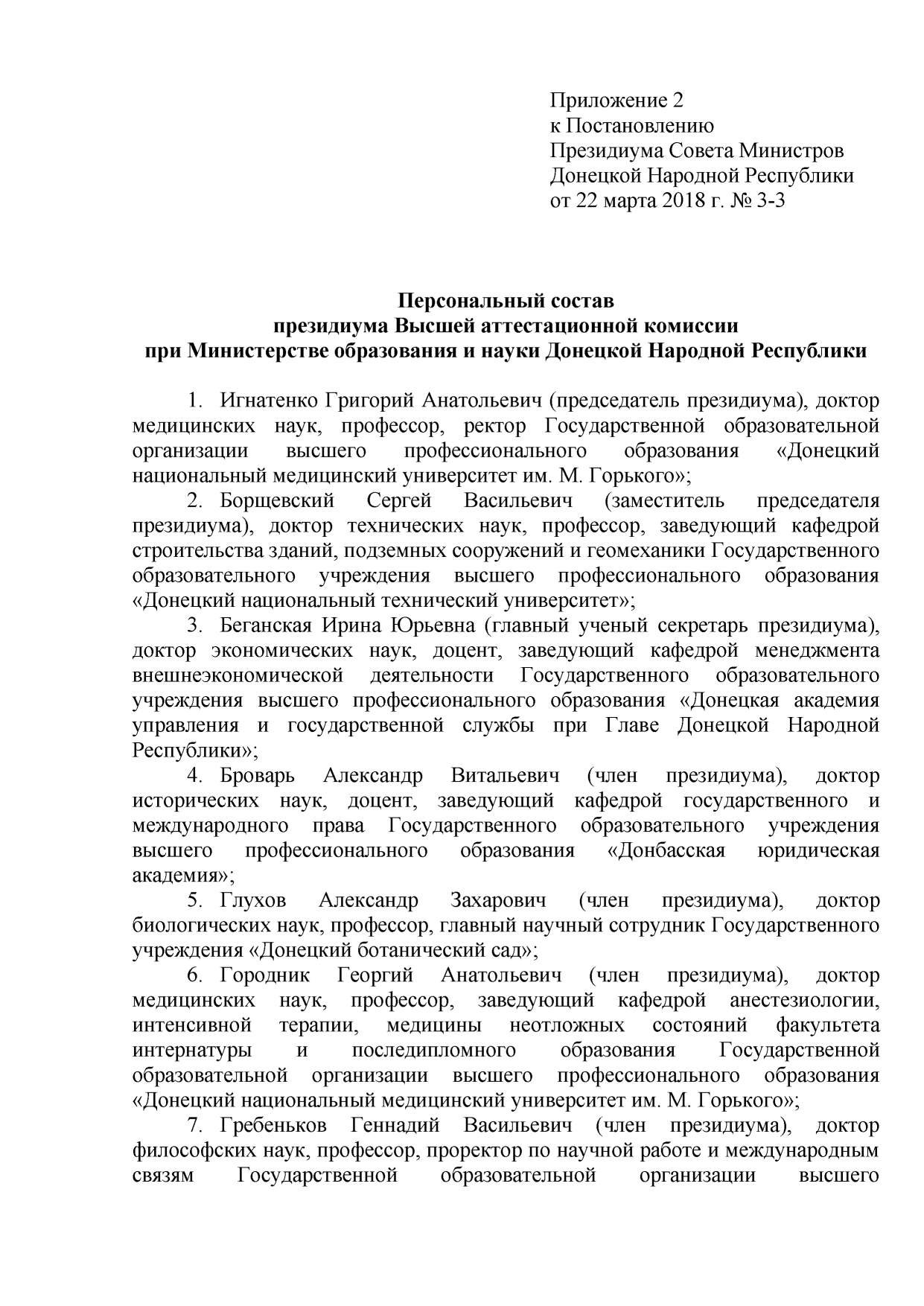 - Внести изменения в Приложение 2 Постановления Совета Министров Донецкой Народной Республики от 24 июля 2015 г. № 14-9 «Об утверждении состава Высшей аттестационной комиссии при Министерстве образования и науки Донецкой Народной Республики», утвердив его в новой редакции (приложение 2). (Постановление Совета Министров ДНР № 14-9 от 24.07.2015 г. утратило силу Постановлением Правительства ДНР № 75-10 от 20.11.2020 г.).