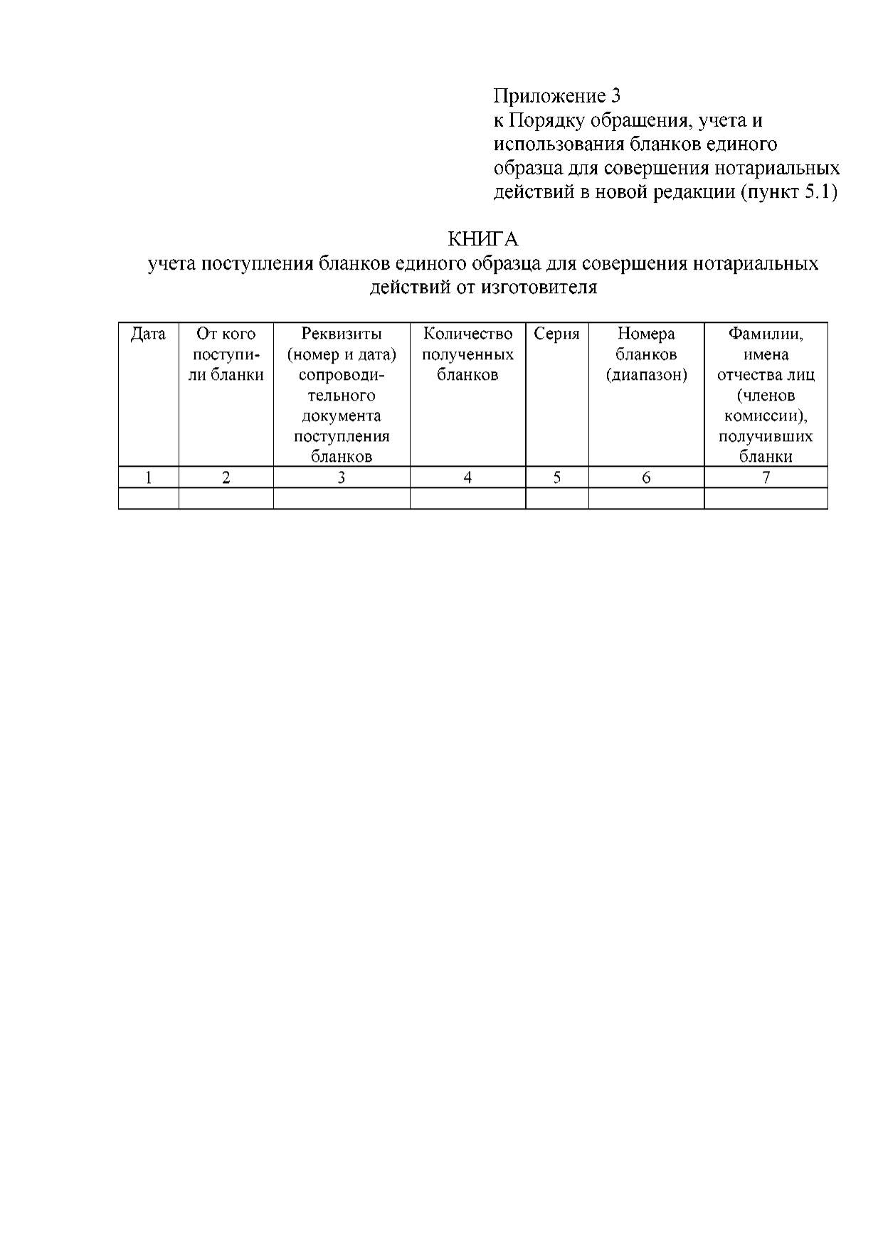 5.1. Учет поступления бланков от изготовителя осуществляется в Книге учета поступления бланков единого образца для совершения нотариальных действий от изготовителя (приложение 3).