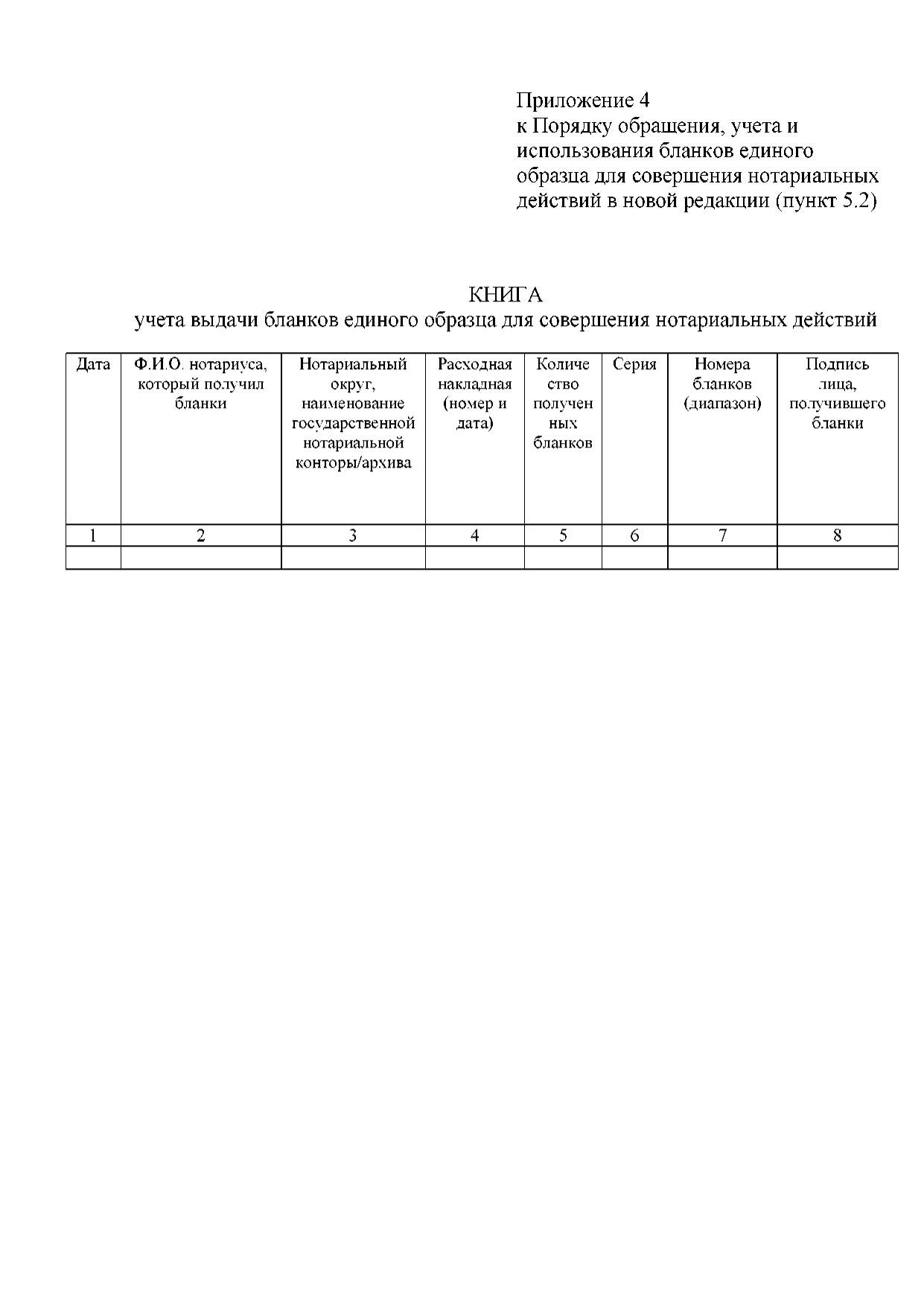 5.2. Учет выдачи бланков нотариусам в Донецкой Народной Республике осуществляется уполномоченными лицами в Книге учета выдачи бланков единого образца для совершения нотариальных действий (приложение 4).