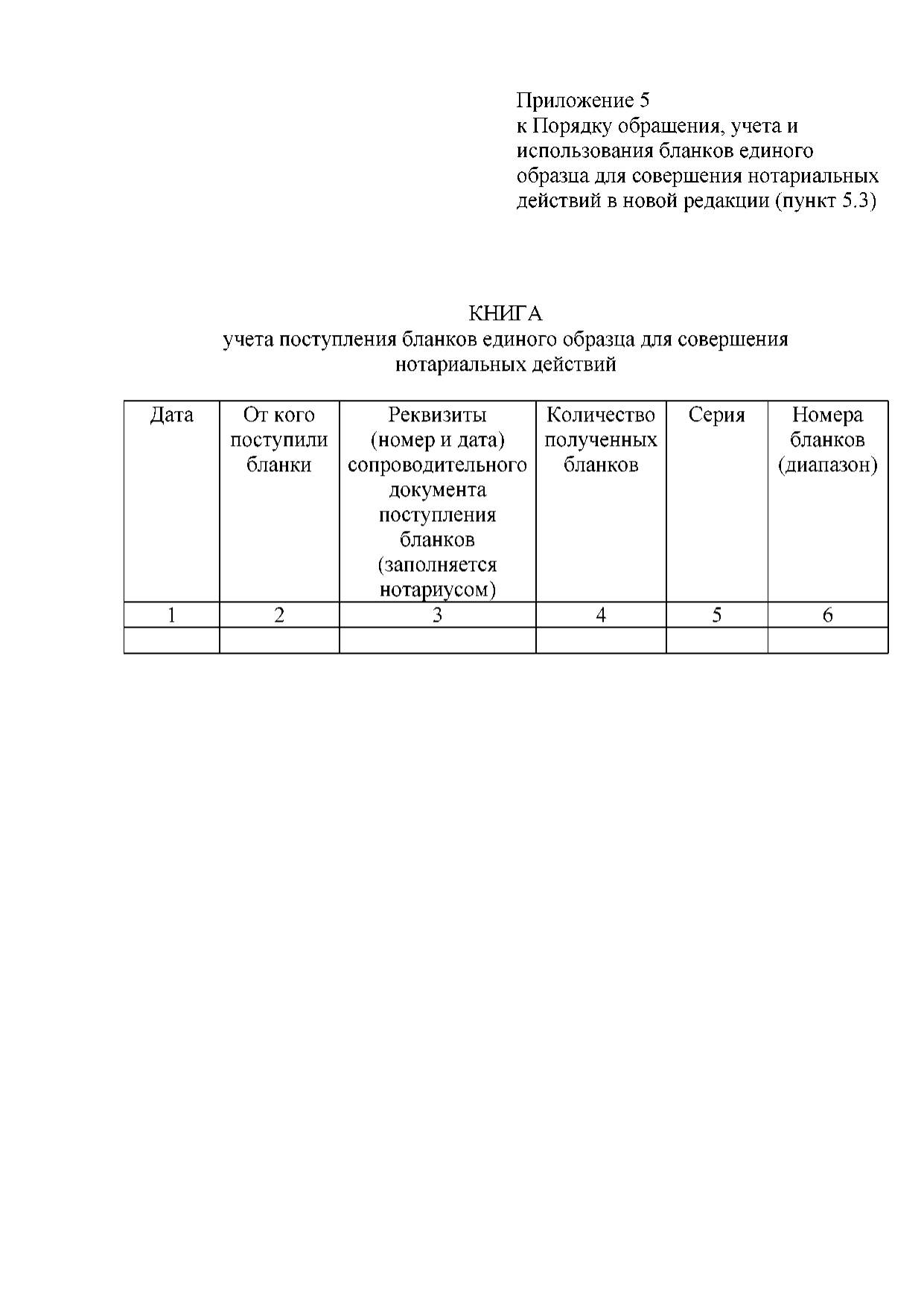 5.3. Учет поступления бланков нотариусами в Донецкой Народной Республике осуществляется в Книге учета поступления бланков единого образца для совершения нотариальных действий (приложение 5).