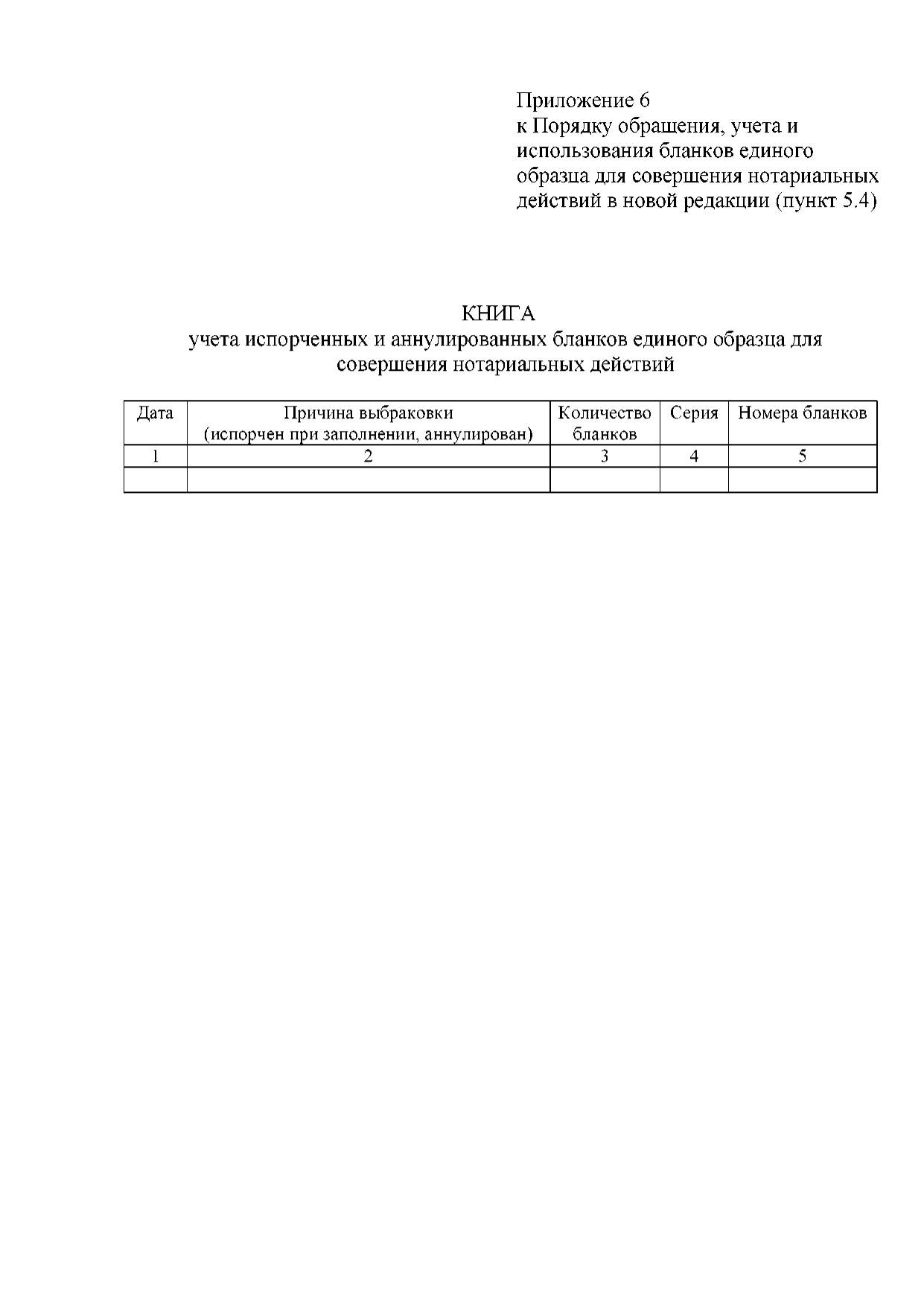 5.4. Учет испорченных и аннулированных бланков ведется нотариусами в Донецкой Народной Республике в Книге учета испорченных и аннулированных бланков единого образца для совершения нотариальных действий (приложение 6).