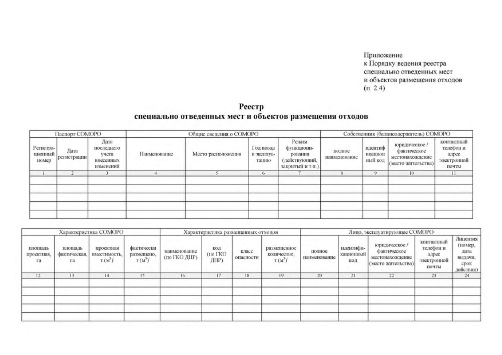 1) реестр специально отведенных мест и объектов размещения отходов (далее — Реестр СОМОРО) — информационный ресурс, содержащий обобщенные сведения о СОМОРО, предназначенные для оценки их состояния, использования при осуществлении государственного экологического контроля в сфере обращения с отходами, принятия управленческих, хозяйственных и иных решений в сфере обращения с отходами на территории Донецкой Народной Республики.