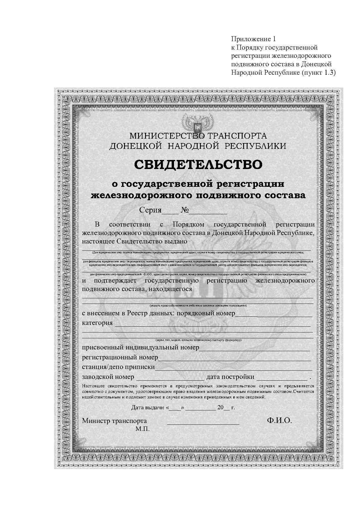 приложению 1 к настоящему Порядку, удостоверяющий факт внесения в Реестр сведений о государственной регистрации железнодорожного подвижного состава.