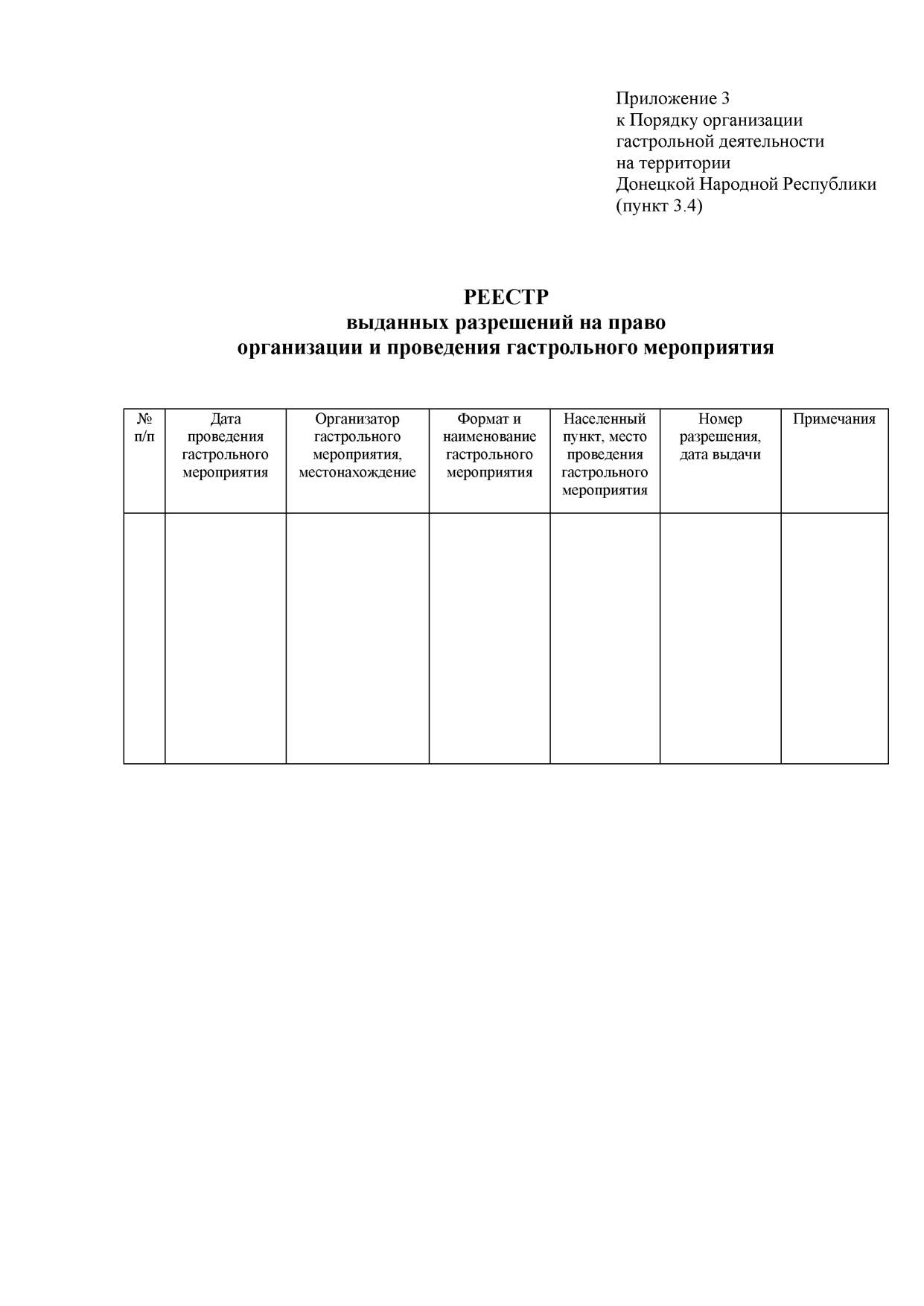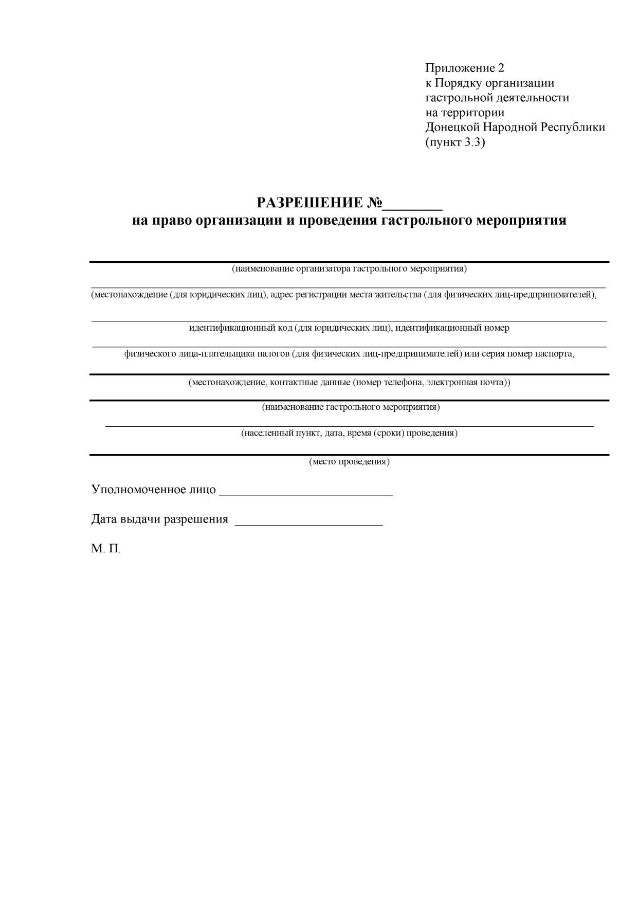 3.3. В течении двух рабочих дней со дня издания приказа, указанного в пункте 3.2 настоящего Порядка, республиканский орган исполнительной власти, реализующий государственную политику в сфере культуры, выдает разрешение на бесплатной основе организатору гастрольного мероприятия по форме согласно Приложению 2 к настоящему Порядку, которое действительно в пределах городов и районов Донецкой Народной Республики, в которых проводятся гастрольные мероприятия.