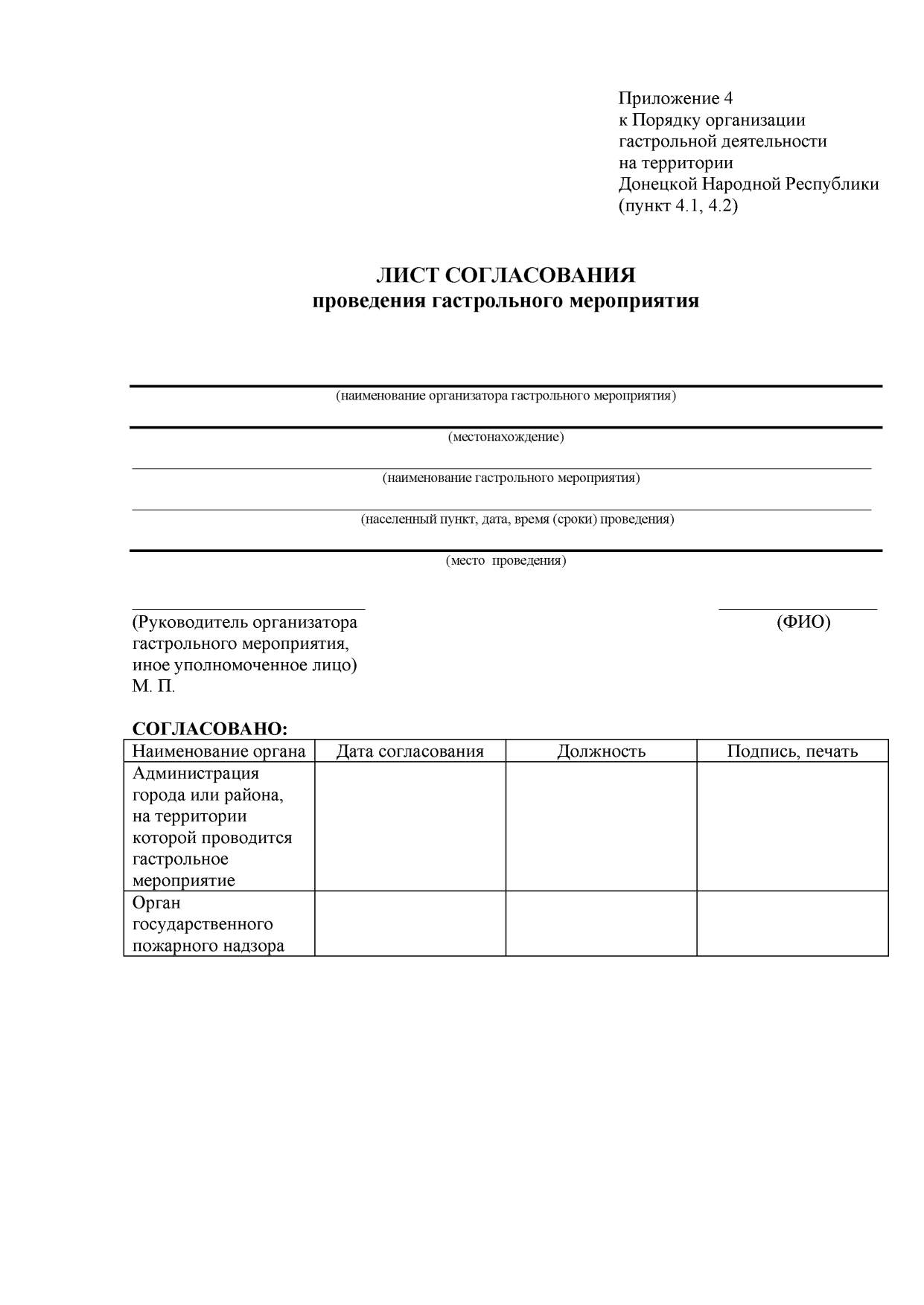 4.1. Для проведения гастрольного мероприятия в специально не предназначенных для этой цели местах организатор гастрольного мероприятия обязан обратиться в администрацию города или района, на территории деятельности которой проводится гастрольное мероприятие, с заявлением о согласовании проведения гастрольного мероприятия. К заявлению прилагается лист согласования согласно Приложению 4 к настоящему Порядку.