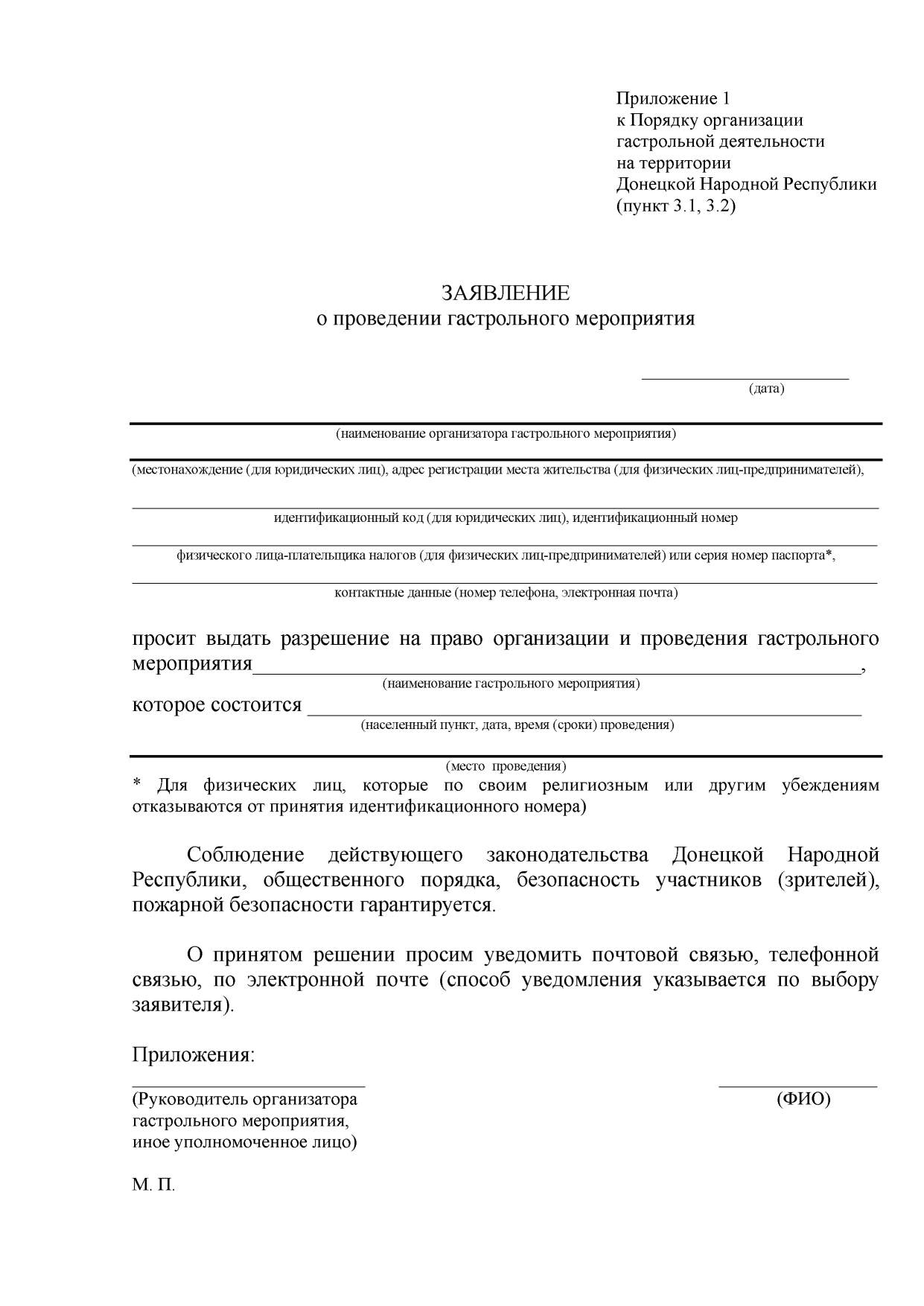 Форма заявления о согласовании проведения гастрольного мероприятия, порядок рассмотрения документов и согласования гастрольного мероприятия в специально не предназначенных для этой цели местах (под открытым небом или в помещениях) определяется администрациями городов и районов.