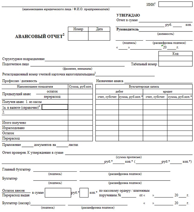 2 Форма авансового отчета приведена для осуществления операций в денежной единице Донецкой Народной Республики. В случае выдачи подотчетному лицу денежных средств, возврата неиспользованного остатка в валюте, отличной от денежной единицы Донецкой Народной Республики, необходимо откорректировать отмеченные знаком «*» поля на название соответствующей валюты.