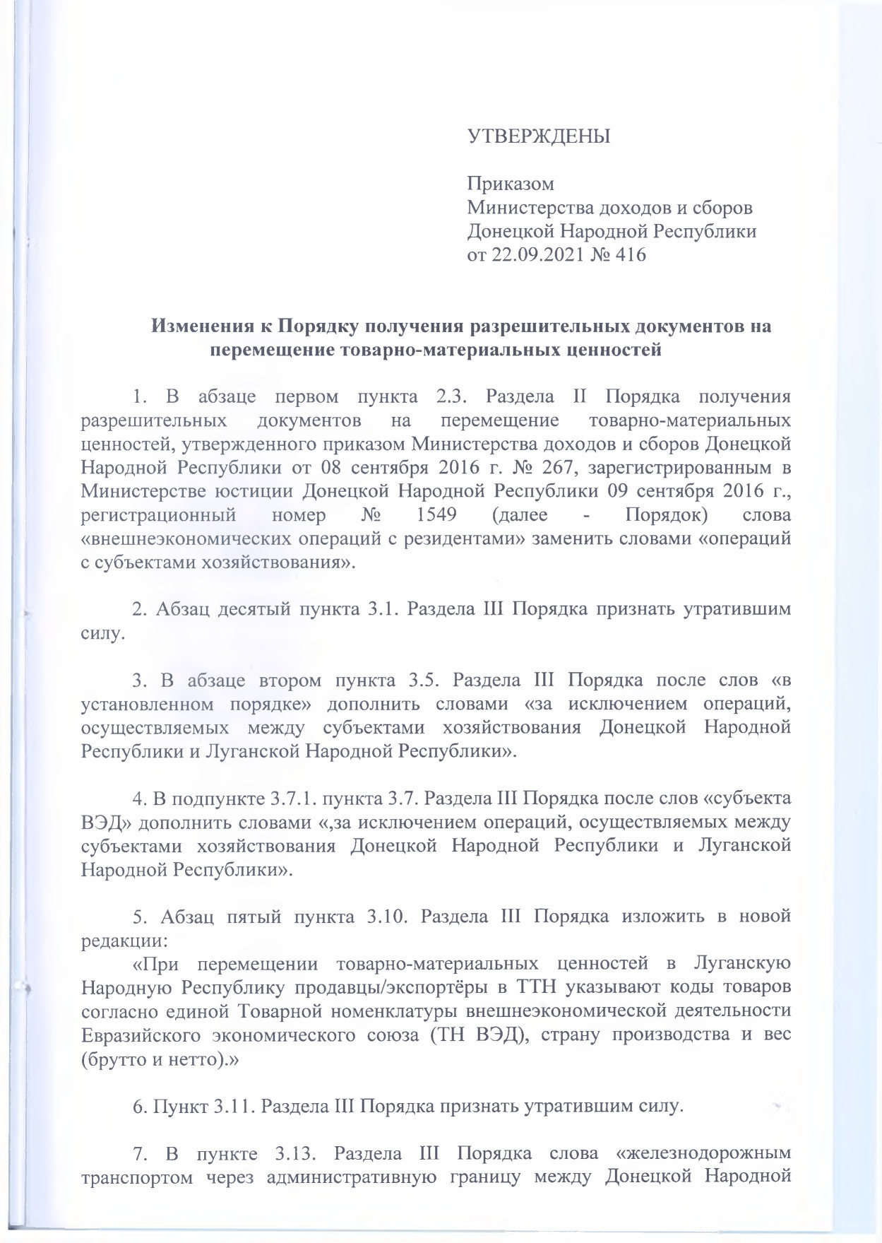 - Утвердить Изменения к Порядку получения разрешительных документов на перемещение товарно-материальных ценностей, утвержденному приказом Министерства доходов и сборов Донецкой Народной Республики от 08 сентября 2016 г. № 267, зарегистрированному в Министерстве юстиции Донецкой Народной Республики 09 сентября 2016 г., регистрационный номер № 1549, которые прилагаются.