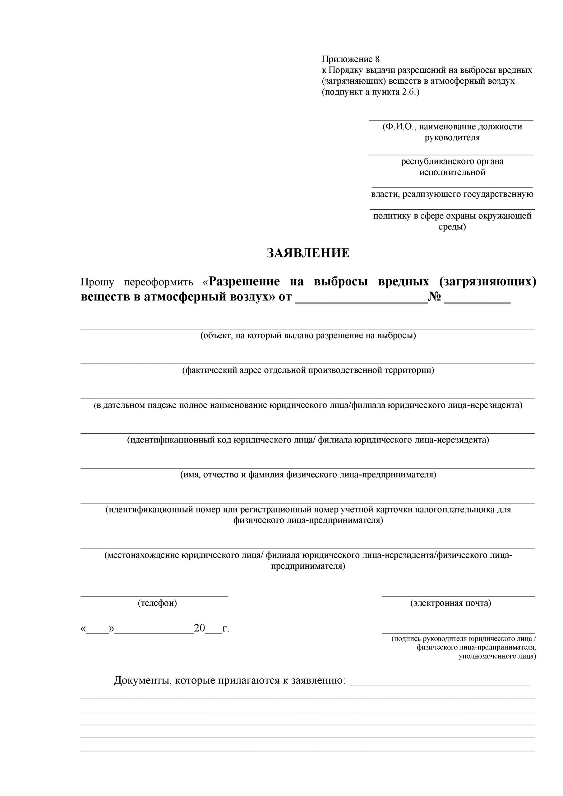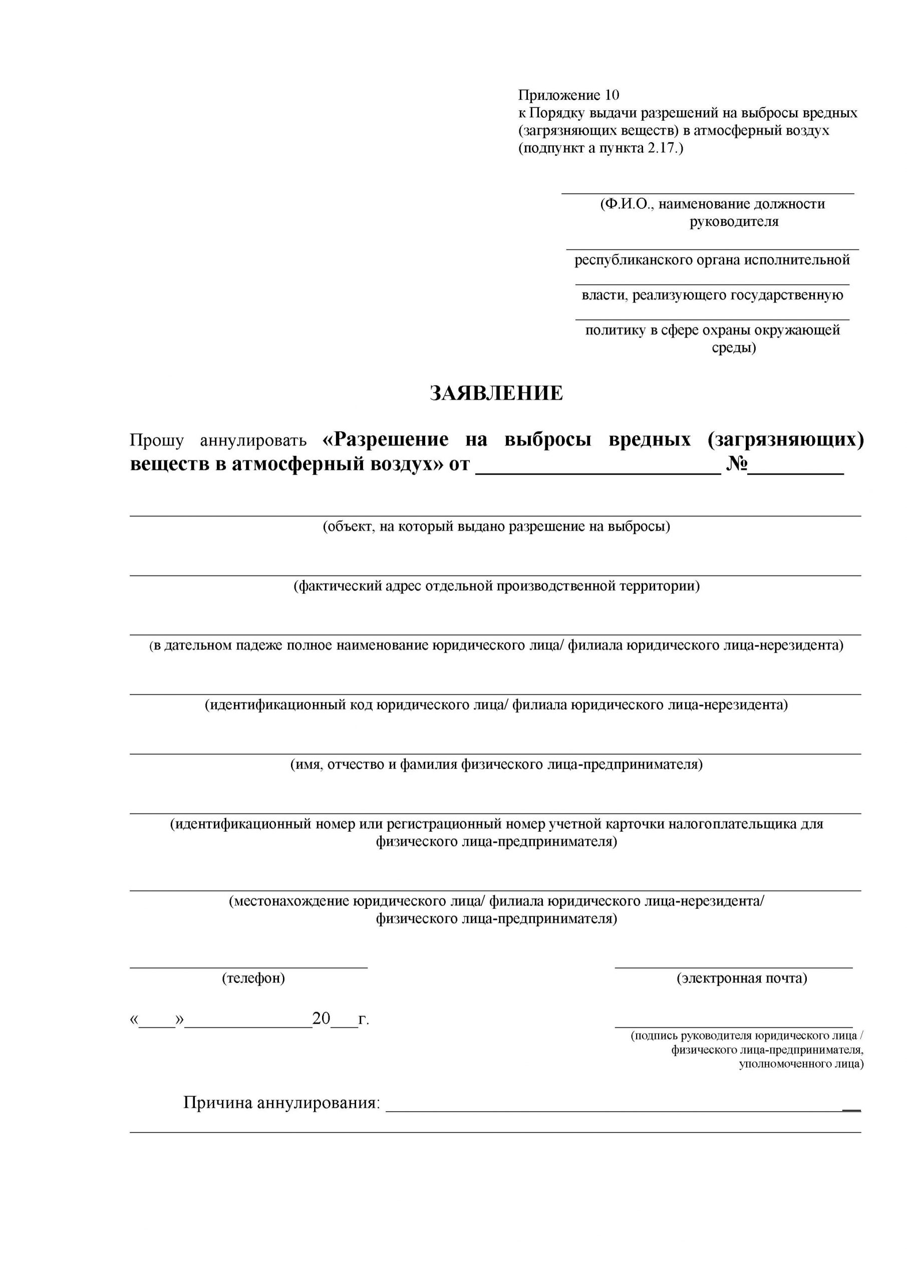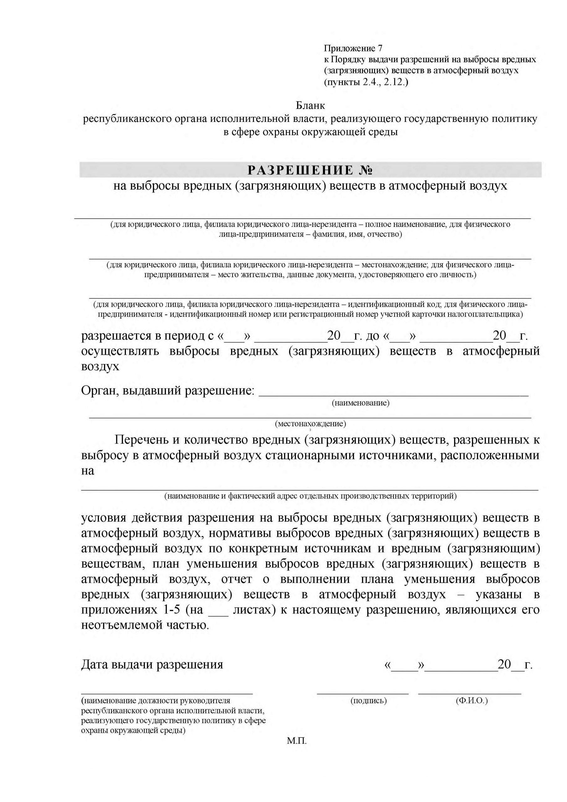 2.4. Разрешение на выбросы оформляется на бланке республиканского органа исполнительной власти, реализующего государственную политику в сфере охраны окружающей среды, по форме, указанной в Приложении 7 к настоящему Порядку.