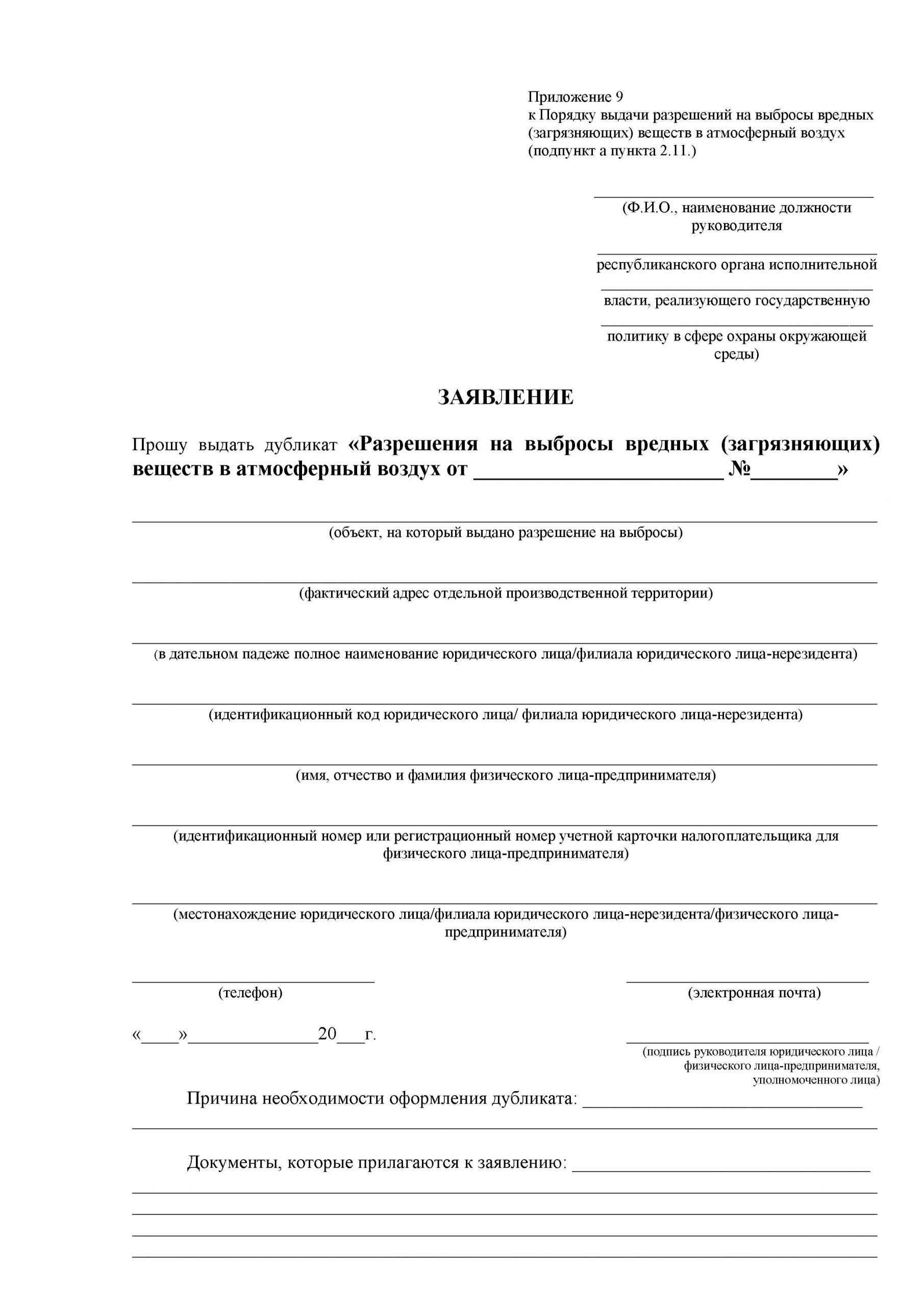 а) заявление о выдаче дубликата по форме, указанной в Приложении 9, с указанием оснований для получения дубликата Разрешения на выбросы;