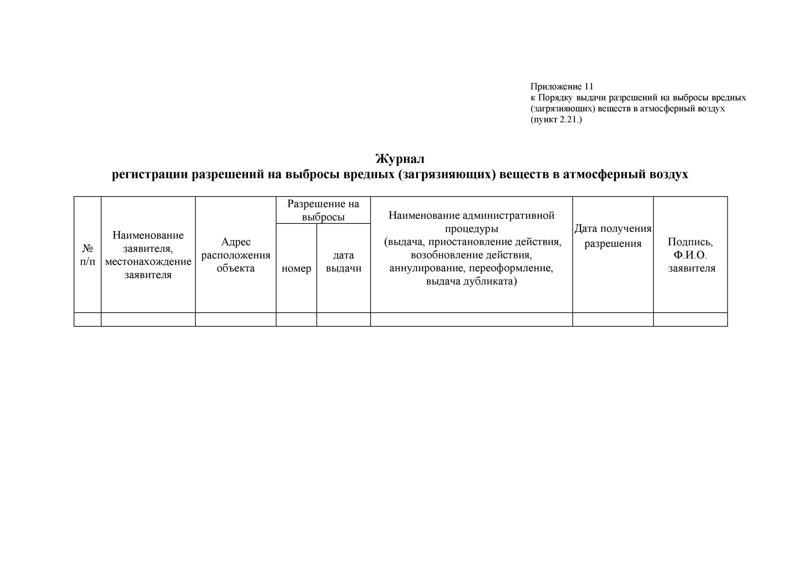 2.21. Регистрация и учет выданных, переоформленных, приостановленных, возобновленных, аннулированных и дубликатов Разрешений на выбросы осуществляется в журнале регистрации Разрешений на выбросы вредных (загрязняющих) веществ в атмосферный воздух, оформленном согласно Приложению 11 к настоящему Порядку.