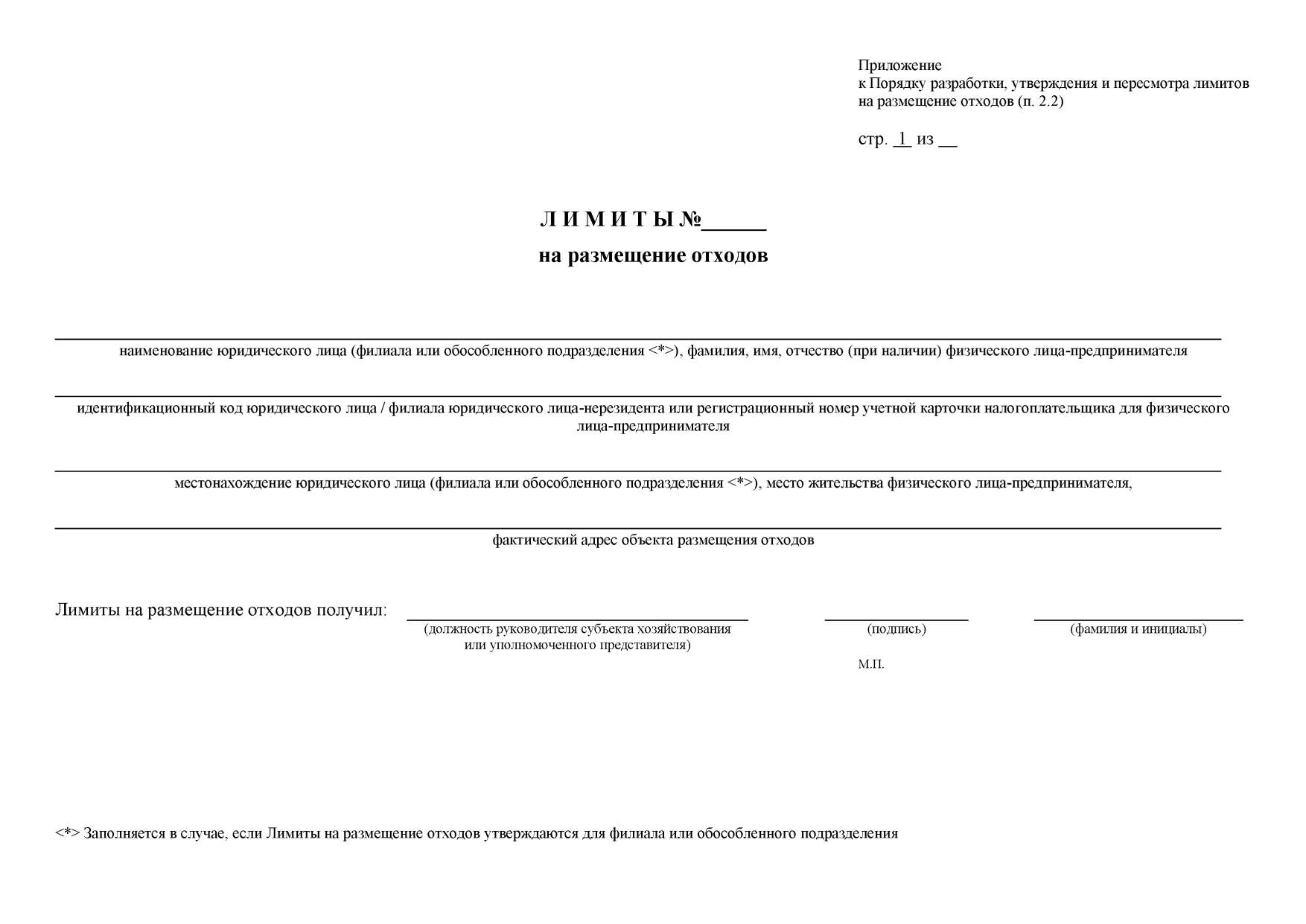 2.2. Проект лимитов на размещение отходов разрабатывается субъектом по форме, указанной в приложении к настоящему Порядку, на основе собственных расчетных данных, заключенных и планируемых для заключения договоров (контрактов) для каждого конкретного вида и количества отходов, которые планируется разместить на эксплуатируемых им объектах размещения отходов.